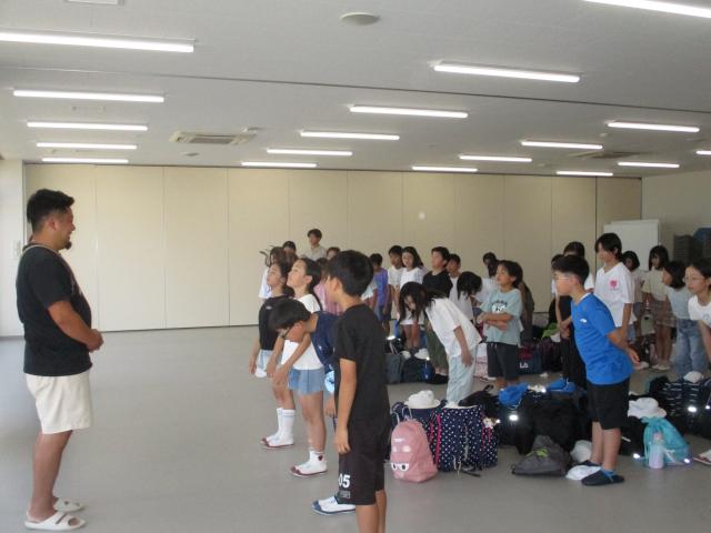 合宿最終日は、宿舎での生活を振り返りながらスタートしました。子どもたちは仲間と協力して身支度や布団の片づけを行い、最後の朝食も大変おいしくいただきました。出発前には宿舎前のサザンビーチで貝拾いを楽しみ、海の宝物を見つける喜びを味わいました。閉舎式では、お世話になった宿舎の方々に感謝の気持ちを伝えました。