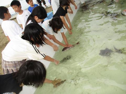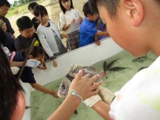 続いて訪れたのは、岡田浦漁港です。漁師さんが引き揚げてくださった大きな網を、子どもたちも一緒に力を合わせて引き上げました。網の中からは、タコやタイ、ヒラメなど多くの生き物が現れ、子どもたちは歓声を上げながら触れ合いました。漁師さんや自然資料館の先生から生き物の特徴や観察の仕方を教えていただき、1日目の学びがつながる瞬間もありました。