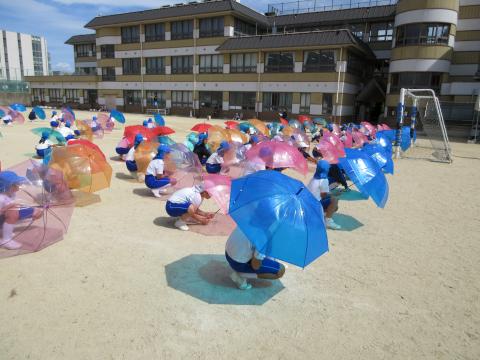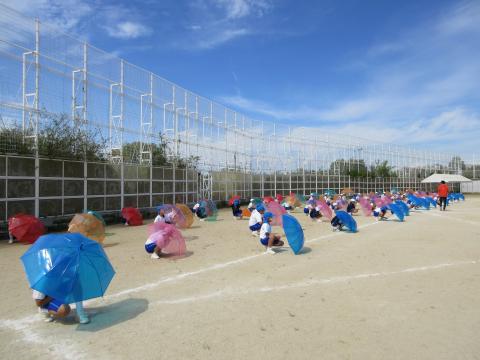 広々とした青空の下、子どもたちは立ち位置や移動の確認、小道具の傘を使った演技にも挑戦しています。