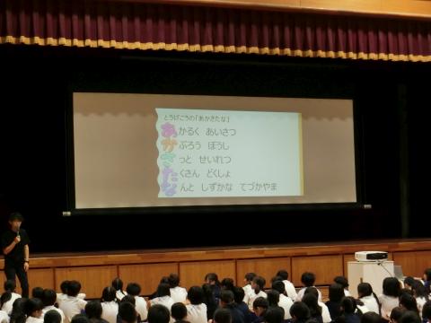 続いて、登下校指導の担当教員と共に、マナーを守り安全に通学するために大切にしたいポイントをおさらいしました。同時に、各学年の努力や成長も共有され、子どもたちの励みとなる時間になりました。