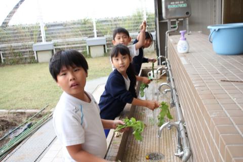【2年生】畑で収穫 ~ダイコンの間引き菜を使って~