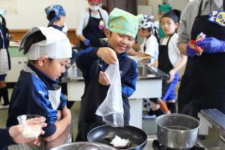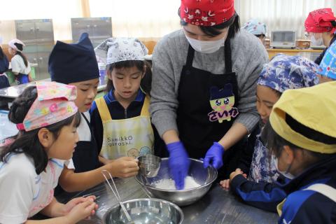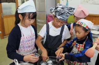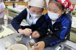 白玉粉がもち米からできていることや、粉に水や調味料を混ぜると形やかたさが変化することを、実際の調理を通して学びました。