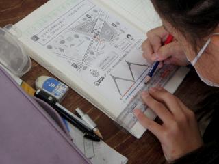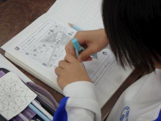 最初はなかなかうまくかけなくても、友だちや先生と助け合いながら挑戦し、「やっとできた!」と喜びの声をあげる姿があちこちで見られました。また、コンパスを使ってつくる模様では、「どこに円が隠れているんだろう?」と探しながら夢中になって取り組んでいました。