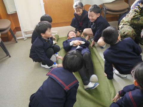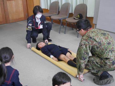 後半の体験学習では、災害派遣時などで用いられる緊急用担架の作り方と使い方について、一人ひとり体験させていただきました。