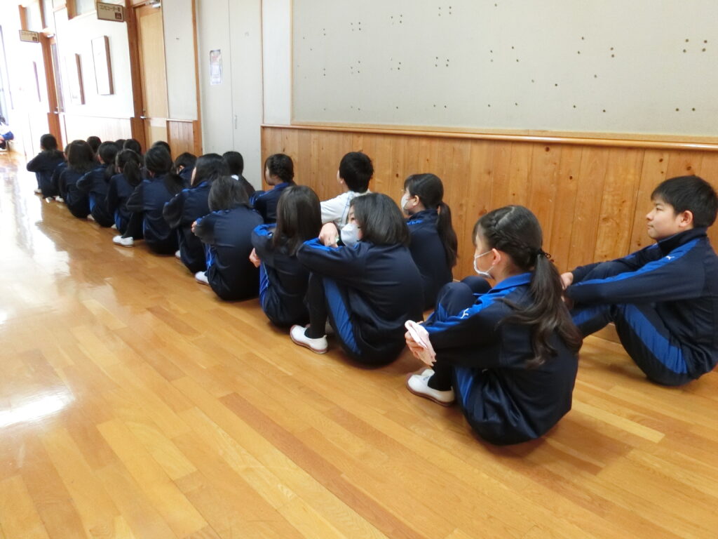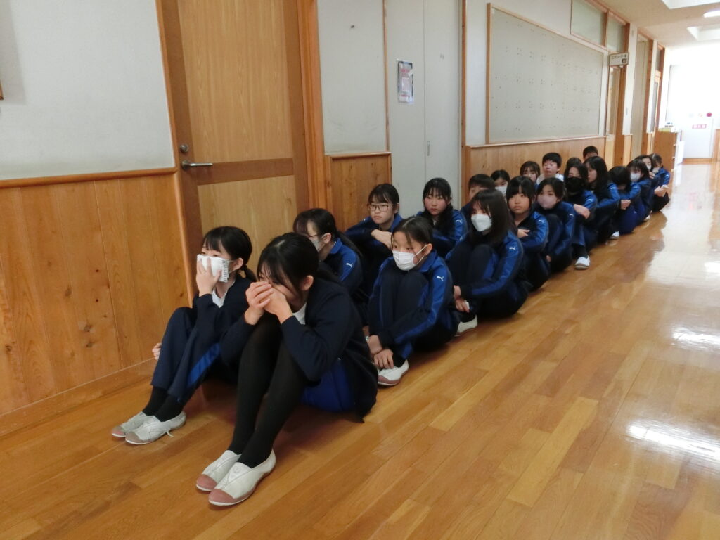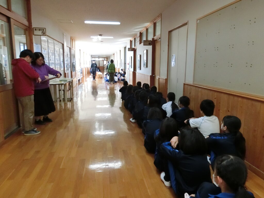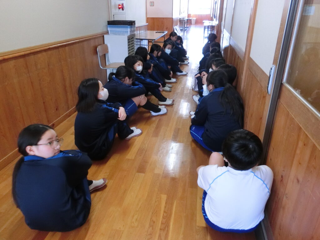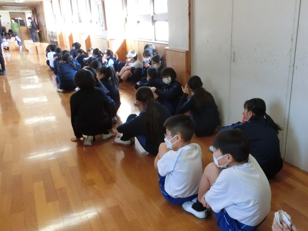 今回は、学内でのインフルエンザ流行に伴う感染拡大防止のため、全校児童が校庭へ避難するのではなく、各学級の廊下へ素早く移動し、点呼と安全確認を行う形での訓練としました。