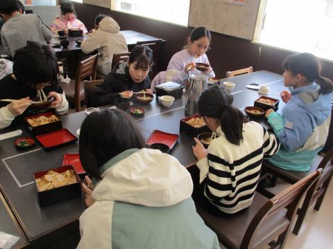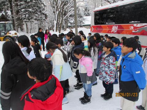 迎えた最終日の朝は、6時半に起床。前夜に自分たちで荷物をまとめていたこともあり、どの子もすっきりとした表情で一日をスタートしました。最後の朝食を味わった後は、荷物を整え、月組・星組が合流して閉舎式を行いました。 宿舎の方々からは温かい言葉をかけていただき、代表児童が感謝の気持ちを伝えました。慣れない雪国での生活でしたが、たくさんの方々に支えられ、子どもたちにとって忘れられない宿泊学習となりました。