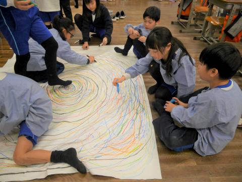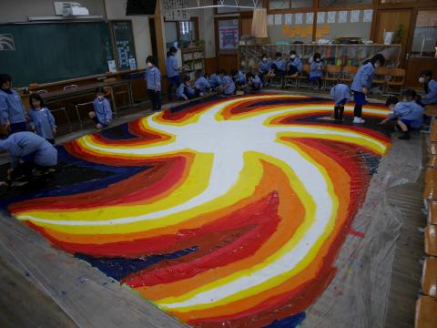 縦4m×横8mという超特大キャンバスを前に、子どもたちは筆を走らせ、次々と鮮やかな色をのせていきました。完成した瞬間、「やった!」と大きな歓声が響き渡りました。