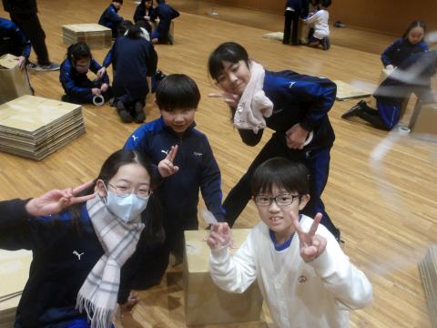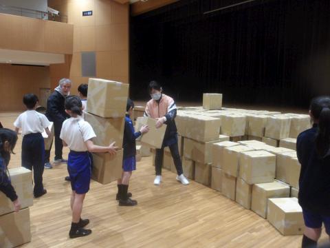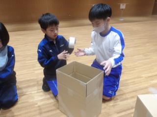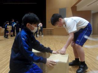作品展の目玉の一つである段ボールのオブジェを作ると知り、子どもたちはやる気満々。それぞれの班に分かれ、協力しながら段ボールを組み立てていきました。