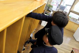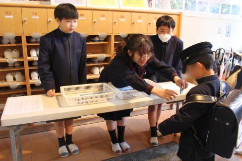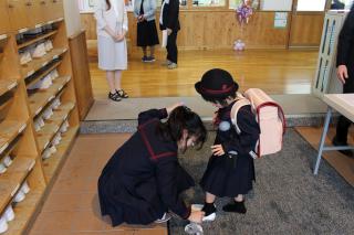 本校の伝統として、6年生が1年生のお兄さん・お姉さんとなり、名札を付けたり教室まで案内したりとやさしく寄り添います。入場の際には手をつないで歩く姿も見られ、その関わりの中で1年生の表情も次第にやわらいでいきました。