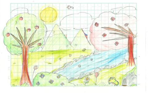 授業の後半では、想像した場面を音読で表現し、最後には想像した場面の様子を色鮮やかな絵に仕上げました。